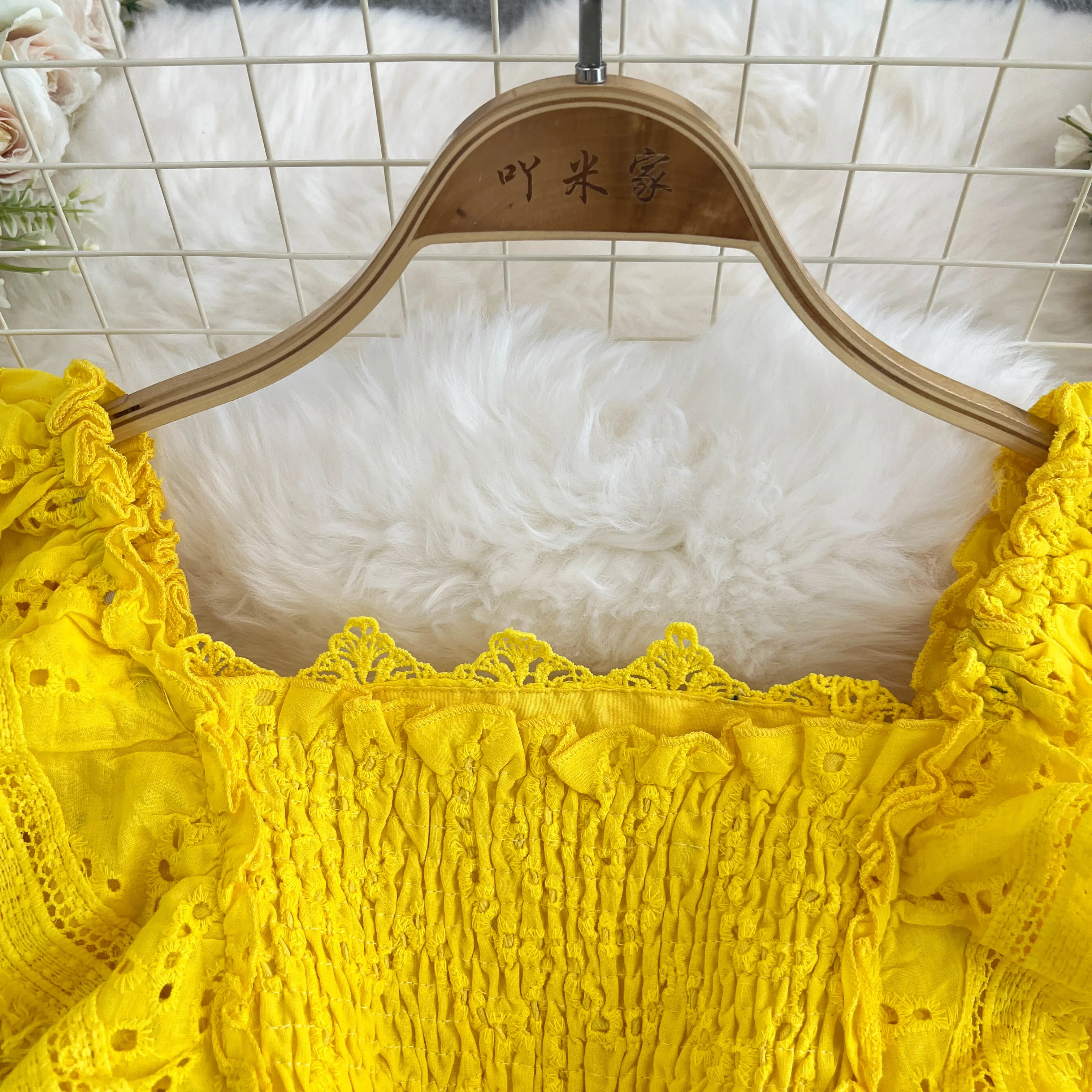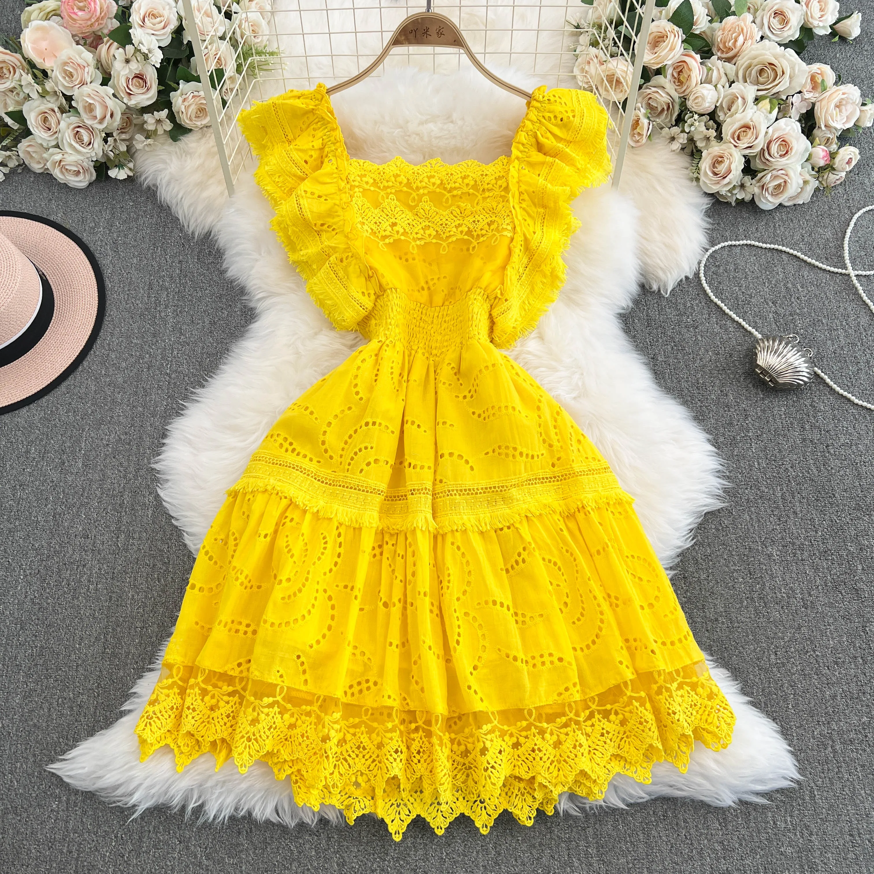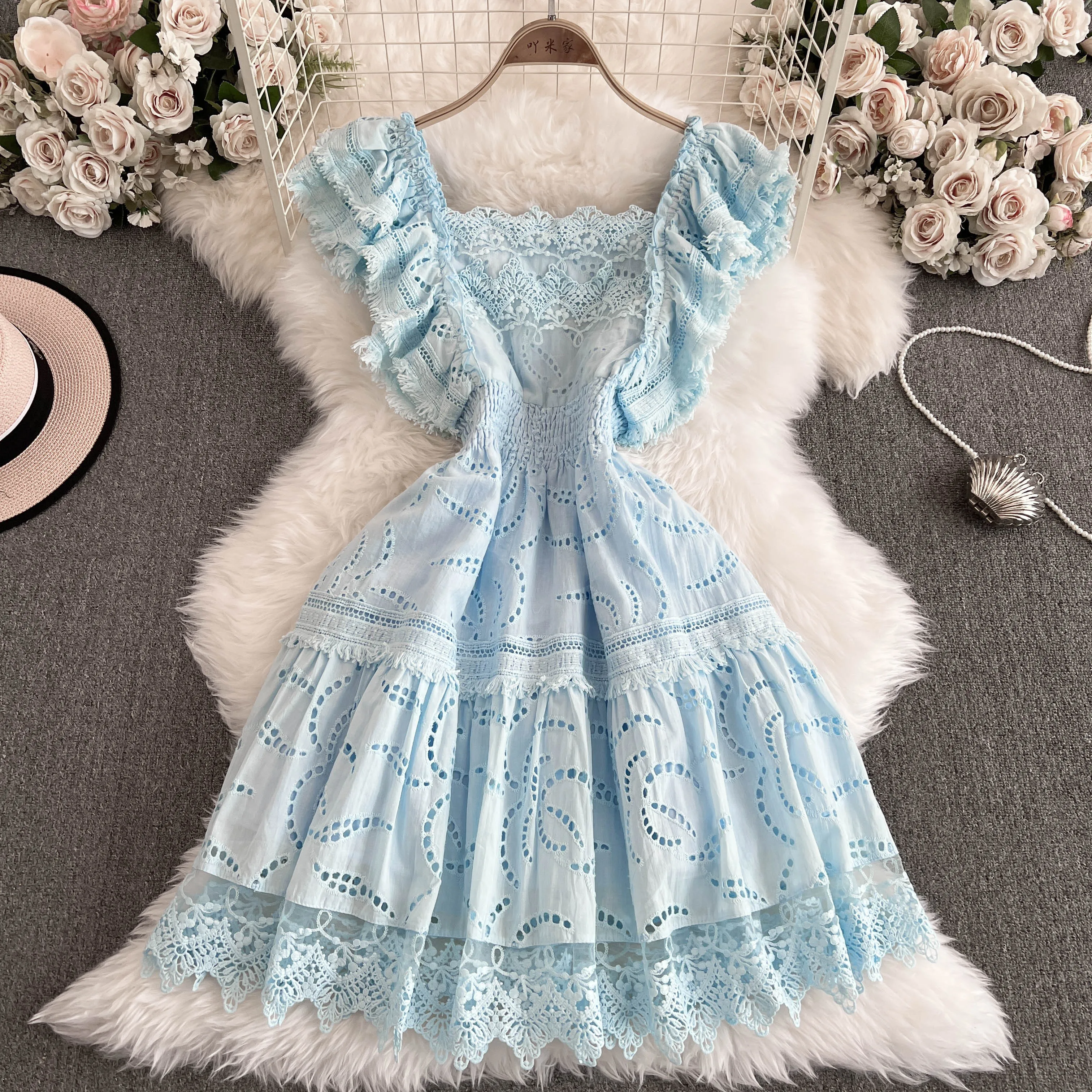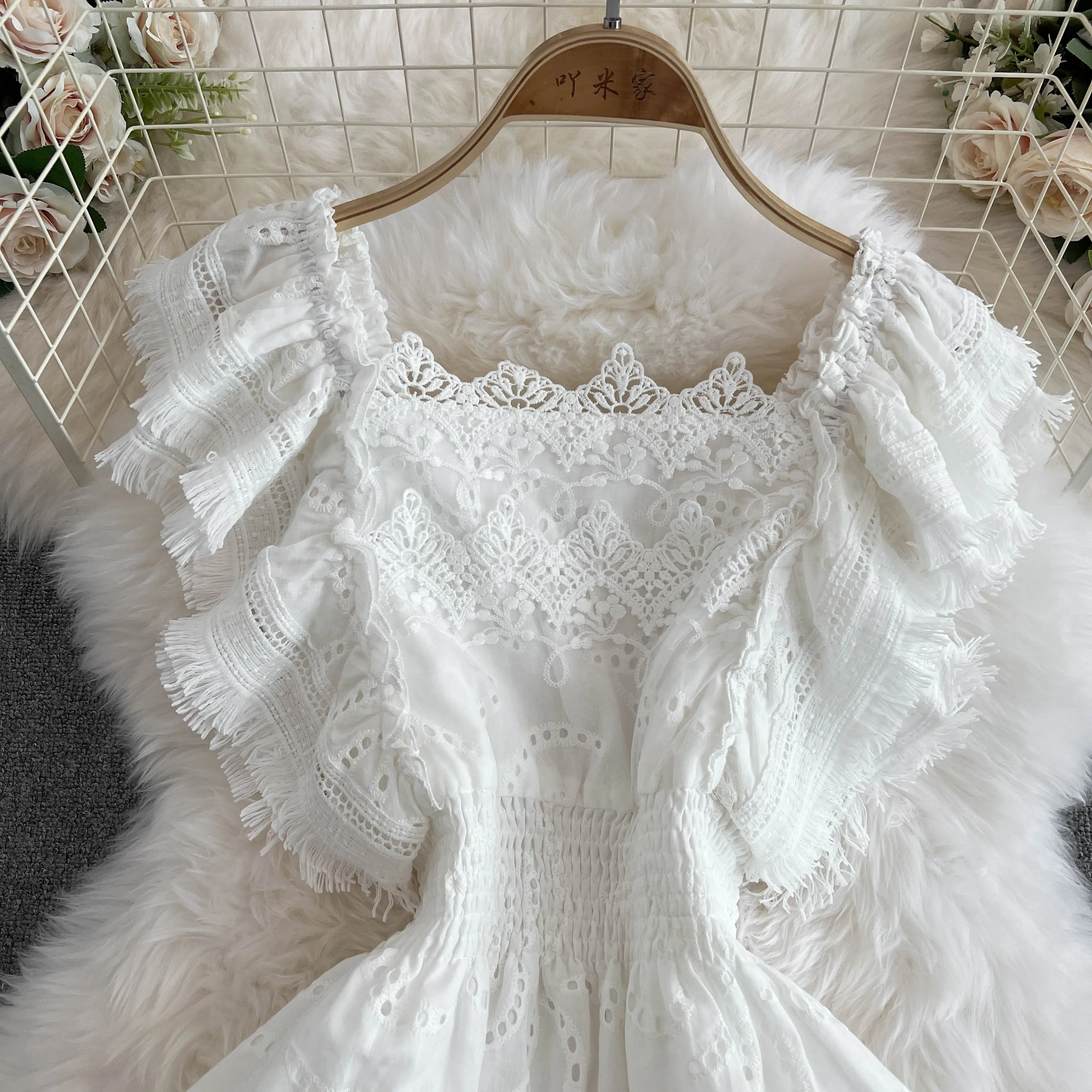 Women Elegant Party Dress Summer Vintage Square Neck Ruffles Short Sleeve Korean Dresses Ladies Slim A-line High Wiast Long Robe